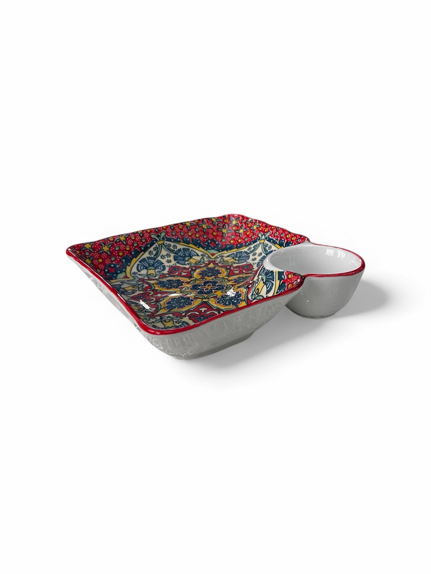 Adu un plus de stil și funcționalitate servirii cu acest platou ceramic elegant, realizat într-o nuanță veselă de galben și decorat cu motive florale multicolore, atent detaliate. Compartimentul lateral integrat este ideal pentru sosuri, dips sau gustări, oferind o prezentare practică și estetică.