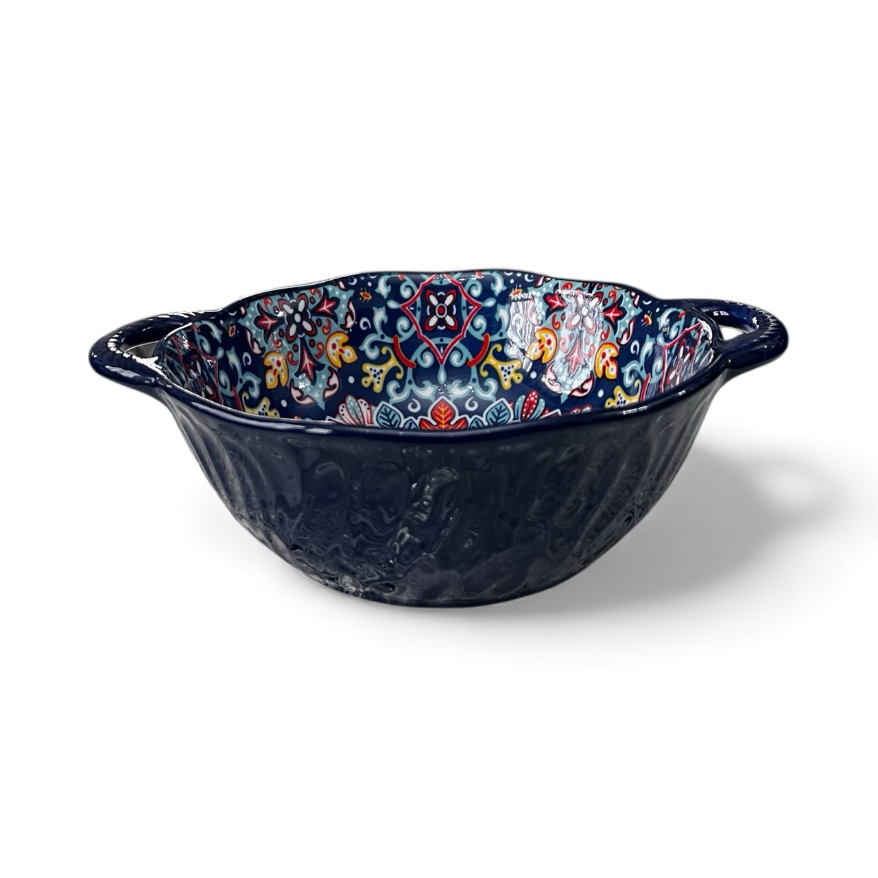 Aduce eleganță și rafinament în servirea mesei cu acest bol ceramic superb, realizat și pictat manual. Interiorul este decorat cu un model floral bogat, în nuanțe vii de roșu, galben, bleu și alb, iar exteriorul într-un albastru profund prezintă motive florale discrete, în relief fin.