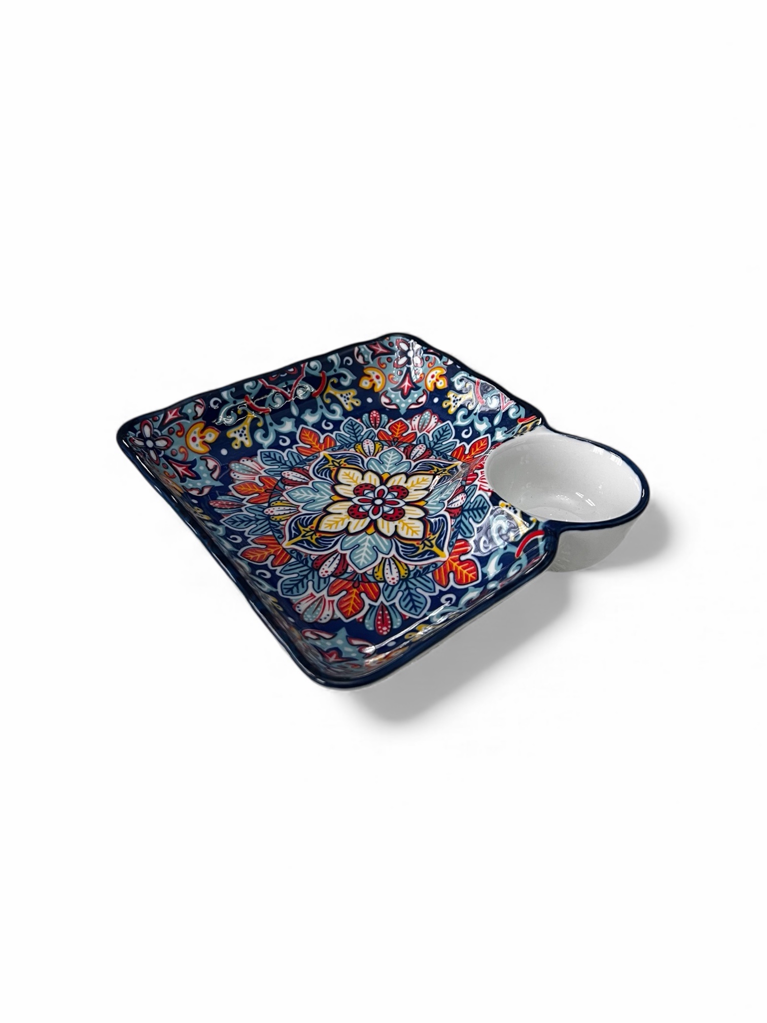 Adaugă un plus de culoare și rafinament mesei tale cu acest bol ceramic decorativ, realizat cu un design floral vibrant, inspirat din motive tradiționale. Forma sa pătrată, cu margini ușor ondulate, este completată de un compartiment lateral rotund, ideal pentru sosuri, aperitive sau gustări.
